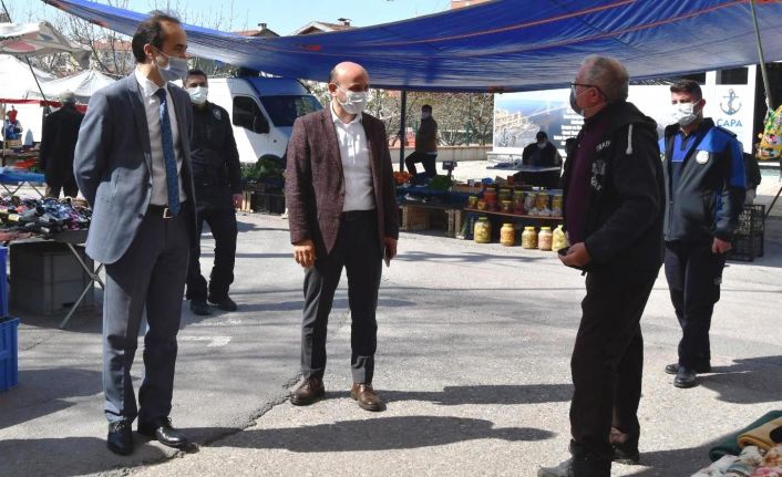 Salgın kuralları çerçevesinde kurulan Semt Pazarını ziyaret ederek denetimlerde bulunan Kaymakam Özyiğit ve Başkan Oral, vatandaşlardan temizlik, maske ve mesafe kurallarına uymalarını istediler.