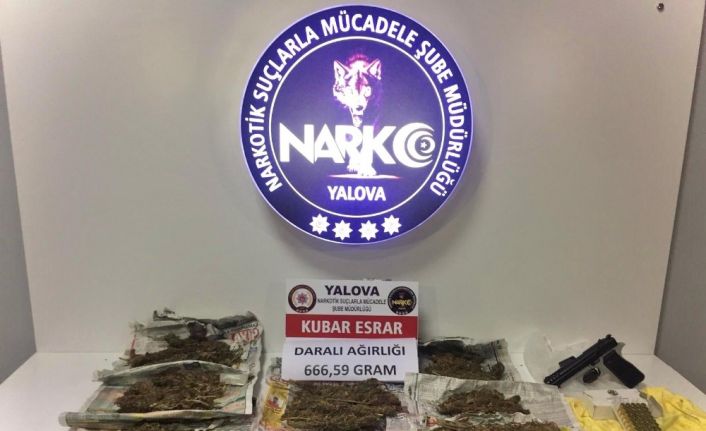 Yalova Emniyet Müdürlüğü Narkotik Suçlarla Mücadele Şube Müdürlüğü yapılan çalışmalar neticesinde Yalova ve Kocaeli ilinde uyuşturucu ticareti yapan kişileri tespit etti. Yapılan teknik takip sonrasında düğmeye basan Yalova polisi Kocaeli’nin Karamürsel ilçesi ve Yalova il merkezinde belirlenen adreslere eş zamanlı operasyonlar gerçekleştirdi. Baskın gerçekleştirilen adreslerde yapılan aramada 666,59 gram esrar maddesi ile 9 mm çapında 1 adet tabanca ile 9 mm çapında 40 adet mermi ele geçirildi. Operasyonlar kapsamında İ.D(3 9) M.D(57) Ş.A(47) ve N.Y(33) adlı 4 kişi gözaltına alındı. Haklarında uyuşturucu veya uyarıcı madde imalatı ve ticareti suçundan adli işlem yapılan şahıslar adliyeye sevk edildiler.