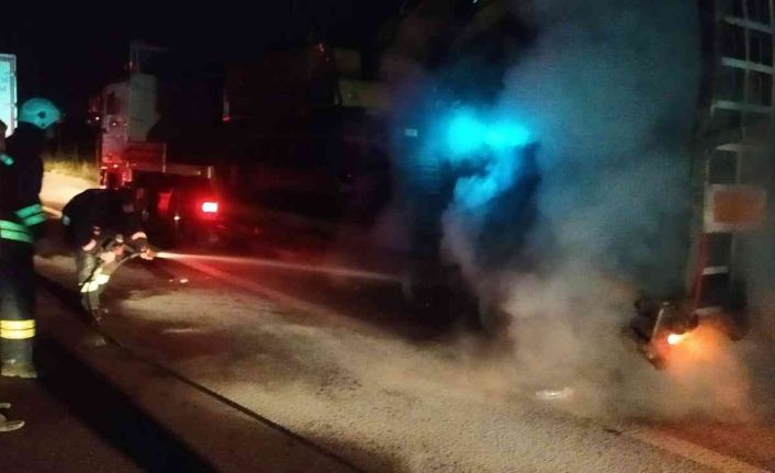 Yalova’nın Altınova ilçesinde seyir halindeki iş makinası yüklü tırın arka lastiğinde çıkan yangın itfaiye ekipleri tarafından söndürüldü.