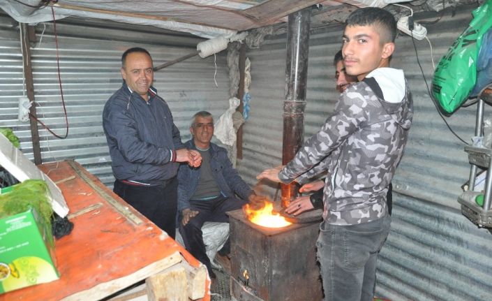 Soğuk havaya karşı soba yakarak müşteri bekliyorlar