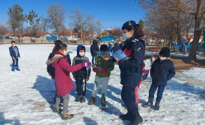 Öğrencilere çocuk dergisi dağıtan jandarma ekipleri daha sonra Toprakpınar köyünde yalnız yaşayan bir kadını ziyaret ederek soba zehirlenmesi ve dolandırıcılara karşı uyardı.