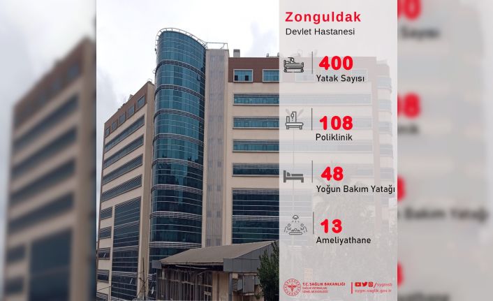 "Batı Karadeniz’in en önemli sağlık tesislerinin başında gelecek, bölgenin sağlık üssü olarak hizmet verecek 400 yataklı Zonguldak Devlet Hastanesi’nin inşaatı tamamlandı. Son teknolojiye sahip cihazlarla hizmet verecek hastanede her branştan 108 poliklinikte hasta kabulü yapacak."