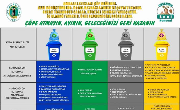 Çaycuma Kent Konseyi Başkanı Tuğrul Dereli yaptığı açıklamada, “Yaşadığımız bu yüzyılda ortaya çıkan küresel ısınma, çevreyi tehdit eden sanayileşme ve çevre kirliliği birtakım önlemler almamızı gerektirmektedir. Hem kurumsal düzeyde hem de bireysel olarak alacağımız önlemlerle gelecek kuşaklara çok daha temiz bir dünya bırakmamız mümkün. Bu önlemlerden biri de sıfır atık uygulaması ile evimizden çıkardığımız çöpü büyük oranda azaltmak. Çaycuma Belediyesi, “Ambalaj atıkları çöp değildir, geri kazanılabilir ve ülke ekonomisine değer katar” bilinciyle yaklaşık 6 yıldır ambalaj atıklarını çöplerden ayrı toplayıp, kurduğu ambalaj atıklarını ayırma tesisinde ayrıştırıp ekonomiye kazandırıyor. Ören Yapı Sitesinde başlattığımız pilot uygulama ile vatandaşlarımızın ambalaj atıklarını (kağıt, atıklar-cam, atıklar-metal, atıklar-plastik, atıklar) artık kaynağında ayrıştırıp, kağıt atıklar için mavi, metal atıklar için gri, plastik atıklar için sarı ve cam atıklar için yeşil renkte ambalaj atık kutularına ayrı ayrı bırakmaları konusunda bilinç ve farkındalık oluşturmayı hedefliyoruz. Bunun için eğitim vereceğiz, düzenli takip ve kontrol yapacağız. Vatandaş olarak bu bilince ve farkındalığa sahip olduğumuzda atık oluşumunu önemli derecede azaltabiliriz. Çöp döküm alanlarında yığınları azaltmayı sağlayarak buradan oluşan ve küresel ısınmanın nedenleri arasında bulunan metan gazının atmosfere yayılımını önleyebiliriz. Ambalaj atıklarını kaynağında ayırarak ayırma tesislerinde daha az zaman ve işgücü ile ayırma işlemi yapılmasını sağlayabiliriz. Ambalaj atıklarının geri dönüşümüne destek olarak ülke ekonomisine ve geleceğimize değer katabiliriz. Doğal kaynaklarımızın olması gerekenden hızlı bir şekilde tüketilmesine ve gelecek yıllara yönelik ciddi çevre ve kaynak sorunlarının ortaya çıkmasına engel olabiliriz. Ambalaj atıklarının geri dönüşümü ile enerji tasarrufu sağlayabiliriz. Gelecek nesillere daha temiz ve kaynakların israf edilmediği bir gelecek bırakmak için ambalaj atıklarımızı evimizde, işyerimizde yani kaynağında ayıralım, bu atıklar için ayrılan kutulara bırakalım” dedi.