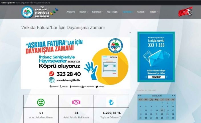 Kdz. Ereğli Belediyesi’nin başlattığı “Askıda Faturalar için Sevgi ve Dostluk Eli” uygulamasına vatandaşlarda katıldı. Tüm dünyada etkisini gösteren Koronavirüs salgınına karşı seferber olan Kdz. Ereğli Belediyesi, ihtiyaç sahibi ailelere sıcak aş ve gıda kolisi desteğini sürdürürken, su faturalarını ödemekte güçlük çeken vatandaşlar için başlattığı ‘Askıda Fatura’ uygulaması halktan destek gördü. İhtiyaç sahibi aileler ile hayırseverleri buluşturmayı hedefleyen “Askıda Faturalar için Sevgi ve Dostluk Eli” uygulaması kapsamında 2 günde 51 fatura askıdan indirildi. 51 faturanın bedeli olan 6.290,78 TL belediye yöneticilerinin ve meclis üyelerinin de aralarında olduğu hayırseverler tarafından ödendi.