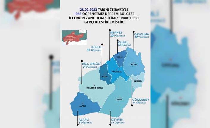 Zonguldak İl Milli Eğitim Müdürlüğü, bin 63 öğrencinin deprem bölgesi illerinden Zonguldak’a nakillerinin gerçekleştirildiğini açıkladı.