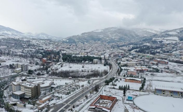 Meteoroloji Genel Müdürlüğü’nün uyarılarının ardından yoğun kar yağışının etkili olduğu il genelinde karla mücadele çalışmaları sürüyor. Ekiplerin kış nöbeti sürerken Devrek ilçesinde ise kar yağışı havadan görüntülendi. Adeta beyaz gelinliğini giyen ilçede ortaya doyumsuz görüntüler çıktı. Bastonu ve simidi ile meşhur olan ilçe kar manzaraları ile de dikkat çekti.
