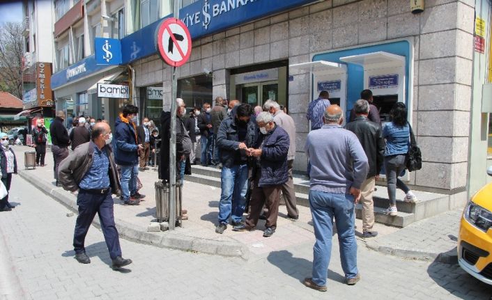 ÖZELLİKLE BANKA ÖNLERİNDE UZUN KUYRUKLAR OLUŞURKEN SOSYAL MESAFE KURALLARI YİNE HİÇE SAYILDI