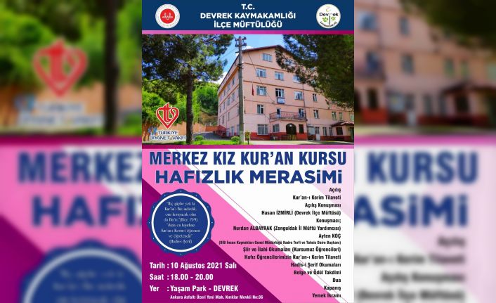 Yine aynı kurstan mezun olan kız öğrenciler için ise Hafızlık Merasimi 10 Ağustos Salı günü saat 18.00 ile 20.00 arasında Ankara yolu üzerinde bulunan Devrek Yaşam Park Bahçesinde gerçekleştirilecek.