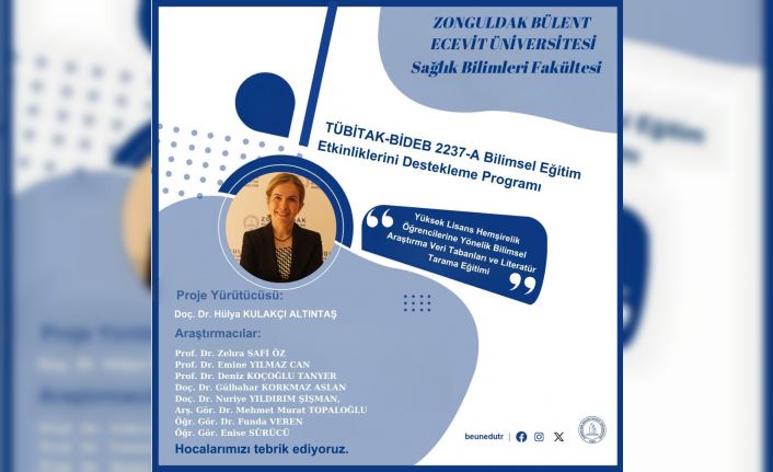 Zonguldak Bülent Ecevit Üniversitesi (ZBEÜ) Sağlık Bilimleri Fakültesi Halk Sağlığı Hemşireliği Anabilim Dalı Öğretim Üyesi Doç. Dr. Hülya Kulakçı Altıntaş’ın yürütücülüğünü üstlendiği "Yüksek Lisans Hemşirelik Öğrencilerine Yönelik Bilimsel Araştırma Veri Tabanları ve Literatür Tarama Eğitimi" başlıklı proje TÜBİTAK-BİDEB 2237-A Bilimsel Eğitim Etkinliklerini Destekleme Programı tarafından destek almaya hak kazandı. Proje etkinliği dahilinde , hemşirelik yüksek lisans öğrencileri bilimsel araştırma sürecine yönelik literatür tarama konusunda eğitim alarak kendi alanlarında veya multidisipliner çalışmalarda yer alabilmeleri ve kanıt düzeyi yüksek bilimsel araştırma faaliyetlerine destek olmak hedefleniyor.