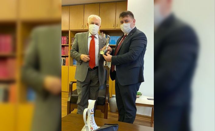GMİS Genel Başkanı Hakan Yeşil, Vatan Partisi Genel Başkanı Doğu Perinçek’e madenci heykeli takdim etti.