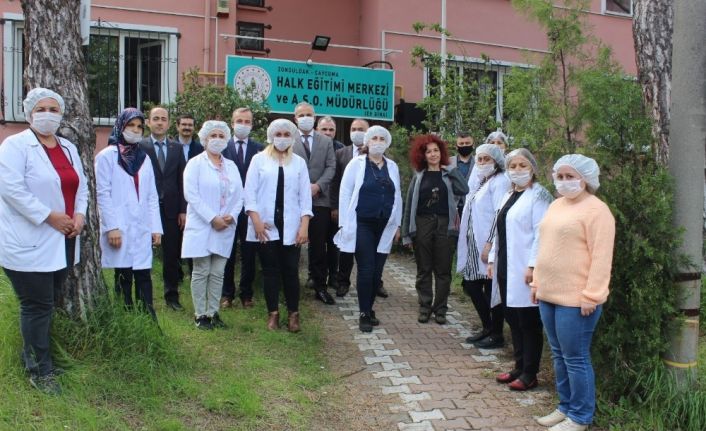 Halk Eğitim Merkezi Akşam ve Sanat Okuluna ziyarette bulunan İl Milli Eğitim Müdürü Harun Akgül önderliğinde İlçe Milli Eğitim Müdürü Ismail Baş, AK Parti Çaycuma İlçe Başkanı Veysel Karani Doğancı’da eşlik etti. Ziyâret esnasında maske üretim çalışmaları konusunda Okul Müdürü Gökhan İncircioğlu’ ndan bilgi alındı. Üretimde görev alan usta öğreticilere ve bu süreçte emeği geçen herkese teşekkür ederek, üretilen maskeleri Çaycuma Devlet Hastanesi Başhekimi Uzman Doktor Sezgin Mutlu’ ya teslim edildi. Başhekim Mutlu “Bu süreçte maske üretimine katkı sağlayan, bizlere maddi manevi destek olan herkese teşekkür ederiz” dedi.