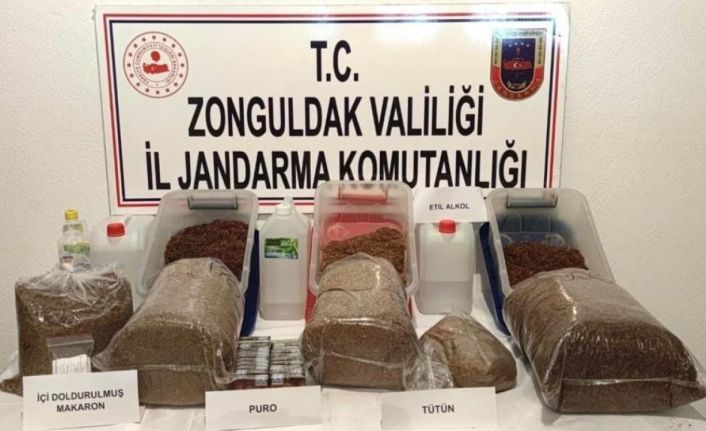Zonguldak’ta jandarma ekiplerince yapılan operasyonda tütün, puro ve çok sayıda makaron ile etil alkol ele geçirildi.