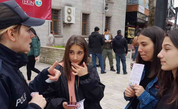Zonguldak’ın Alaplı ilçesinde kadına yönelik şiddetin önüne geçebilmek amacıyla İlçe Emniyet Müdürlüğü ekipleri Hükümet Caddesi üzerinde kurdukları stantta broşür dağıttı.