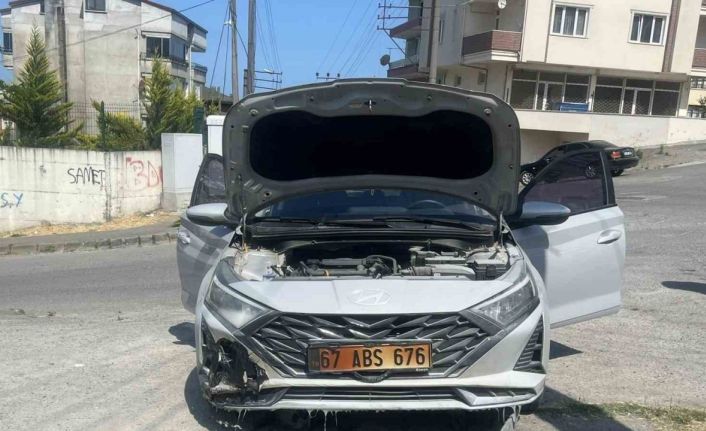 Zonguldak’ın Alaplı ilçesinde elektrik direğinden kopan tellerinden çıkan kıvılcımlarla başlayan alevler, bölgede kuru otları tutuşmasıyla aracın yanmasına sebep oldu.