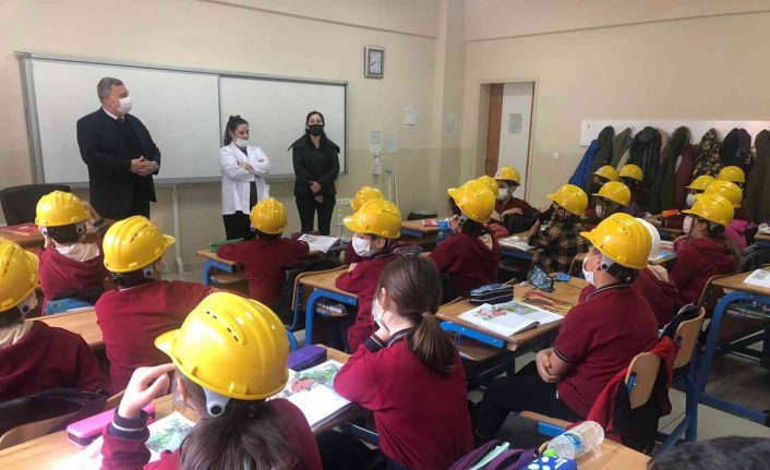Gazi Ortaokulu öğrencileri 4 Aralık Dünya Madenciler Günü sonrası farkındalık oluşturmak amacıyla derse madenci baretleriyle katıldı.