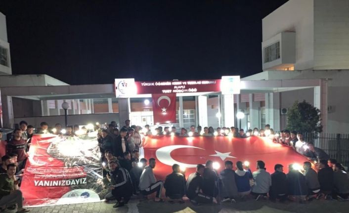 Mehmetçiğe Türkiye’nin dört bir yanından destek gelirken, bir destek de KYK Alaplı Yurt Müdürlüğü’nden geldi. KYK yurdunda kalan öğrenciler, Suriye’nin İdlib kentinde rejim unsurları tarafından düzenlenen hava saldırısında şehit olan askerleri anmak ve Mehmetçiğe destek olmak amacıyla yurt binası önünde toplandı. dev Türk Bayrağı açan gençler "Yanınızdayız" sloganı bulunan pankart açtılar. Ellerindeki telefonların ışığını da açan gençler, "Şehitler ölmez, vatan bölünmez" sloganı attı. Gençlerin bu davranış takdirle karşılandı.