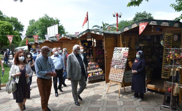 Başkan Halil Posbıyık, Ereğlili sanatçıların el işi ürünlerinin halkla buluştuğu stantların yer aldığı, ahşap ürünlerden, oyuncağa, naht sanatından, sedef kakma çalışmalarına, bastondan, el işlemelerine ve cam, seramik ile sepet ürünlerine kadar büyük bir çeşitliliğe sahip olan Sanat Sokağı’nda süren hazırlıkları yerinde inceledi.