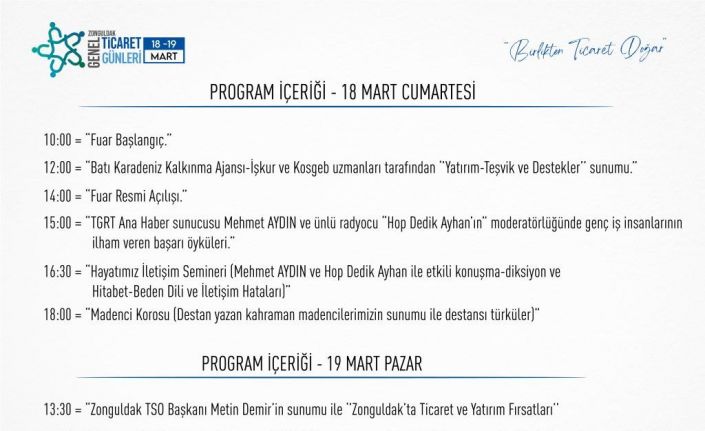 Saat 16.30’da "Hayatımız İletişim Semineri" ile devam edecek olan genel ticaret günlerinin ilk gün finali 18.00’de madenci korosunu ile son bulacak. 19 Mart Pazar günü ise 13.30’da Zonguldak TSO Başkanı Metin Demir’in sunumu ile "Zonguldak’ta ticaret ve yatırım fırsatları" anlatılacak. Saat 15.00’de E-Ticaret Türkiye Akademi kurucusu ünlü e ticaret uzmanı Sedat Ateş’in sunumu ile "Dijital Pazarlama ve E-Ticaret" sunumu gerçekleştirilecek. Ardından fuarın kapanışı gerçekleştirilecek.