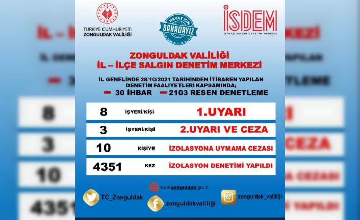 Zonguldak Valiliği İl-İlçe Salgın Denetim Merkezi haftalık korona virüs denetimlerini aralıksız sürdürüyor. Zonguldak il genelinde 28 Ekim tarihinden itibaren yapılan denetim faaliyetleri kapsamında 30 ihbar değerlendirilirken 2103 resen denetleme yapıldı.