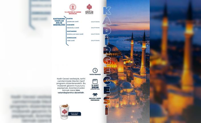 Kastamonu Vakıflar Bölge Müdürlüğü tarafından Kadir Gecesi dolayısıyla Zonguldak Yeni Camii’nde özel bir Mevlid-i Şerif programı düzenlenerek cemaate sıcak salep ikramında bulunulacak.