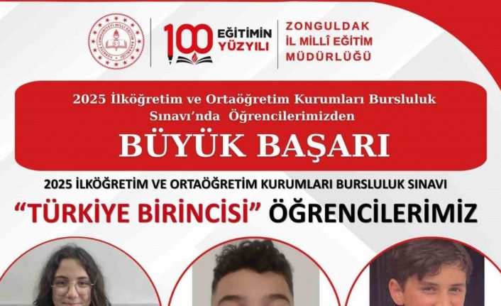 Zonguldak Merkez Gazi Mustafa Kemal Ortaokulu 5. sınıf öğrencisi Hüseyin Can Ateş, Çaycuma Mimar Sinan Ortaokulu 6. sınıf öğrencisi Ahmet Arif Özdemir ve Devrek Atatürk Ortaokulu 5. sınıf öğrencisi Derin Özlen, 2025 yılı Bursluluk Sınavı’nda 500 tam puan alarak Türkiye genelinde birincilik elde etti.