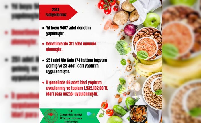 Zonguldak İl Tarım ve Orman Müdürlüğü, 2023 yılı faaliyetleri çerçevesinde yıl boyu 9 bin 457 adet denetimin yapıldığını açıkladı. Denetimlerde 311 adet numune alınırken Alo Gıda 174 hattına gelen 251 şikayetten 23’üne idari yaptırım uygulandığı belirtildi.