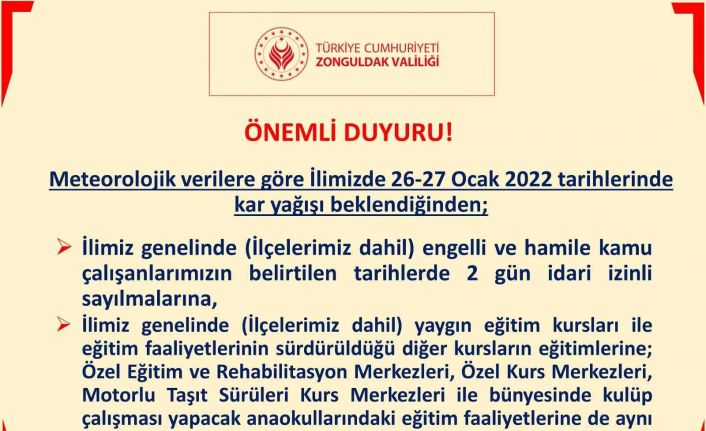 Zonguldak Valiliğinden yapılan açıklamada, meteorolojik verilere göre kentte 26-27 Ocak tarihlerinde kar yağışı beklendiği hatırlatılarak, il genelinde engelli ve hamile kamu çalışanlarının belirtilen tarihlerde iki gün idari izinli sayılmalarına karar verildiği ifade edildi. Yapılan açıklamada ayrıca, "İlimiz genelinde (ilçelerimiz dahil) yaygın eğitim kursları ile eğitim faaliyetlerinin sürdürüldüğü diğer kursların eğitimlerine; Özel Eğitim ve Rehabilitasyon merkezleri, özel kurs merkezleri, motorlu kara taşıt sürücü kurs merkezleri ile bünyesinde kulüp çalışması yapacak anaokullarındaki eğitim faaliyetlerine de aynı günlerde iki gün süreyle ara verilmesine karar verilmiştir"denildi.